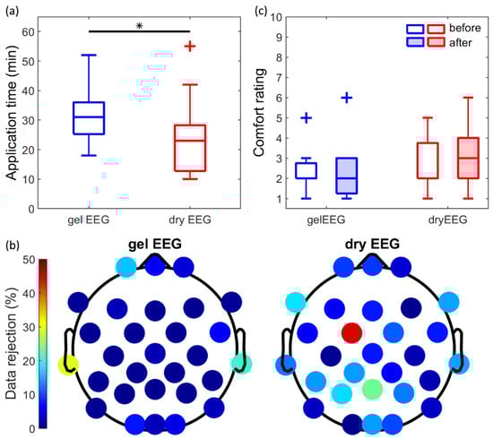 General performance. (a) Application time (min) for the gel EEG system (blue) and the dry EEG system (red). (b) Percentage of data rejection (%) per channel averaged over subjects for the gel EEG system (left) and the dry EEG system (right). 0% = no data rejected; 100% = all data rejected. Color bar from 0–50%. (c) Experienced comfort for the gel EEG system (blue) and the dry EEG system (red), rated by the subject before (open) and after the experiment (shaded). 1 = extremely comfortable; 10 = maximum imaginable pain. * p < 0.05.