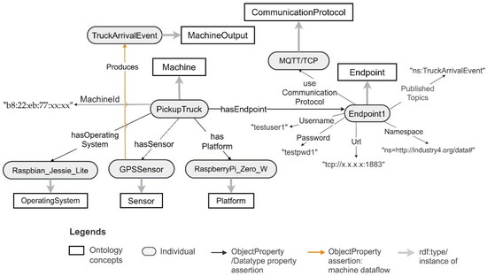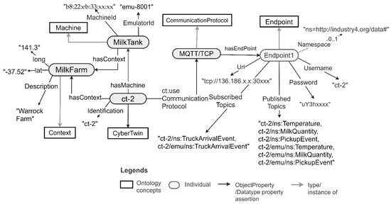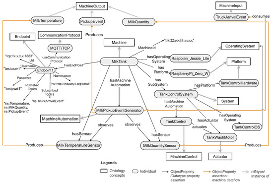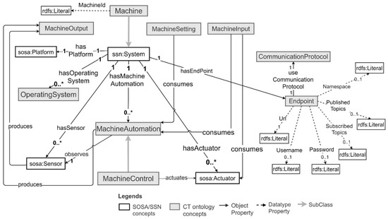 The concepts and relationships provided in the CT ontology to capture machines and their data are depicted in Figure 1. The ontology can be used to model simple machines, which contain a single sensor and an actuator, or complex machines with many sensors, actuators, and machine automation. It contains Communication Protocol and Endpoint concepts to be able to capture the connectivity details of a machine. It reuses the concepts such as Sensor, Actuator, System, and Platform from existing SSN [43]/SOSA [52] ontologies and these are prefixed using “sosa” and “ssn” in Figure 1. An example of CT ontology-based machine modelling is presented in Section 5.1.