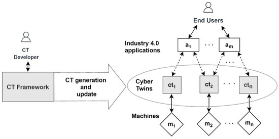 The CT management framework. The framework enables the CT developers to generate and update the CTs of the machines. The Industry 4.0 applications utilize the machines via their corresponding CTs, and end-users interact with these Industry 4.0 applications.