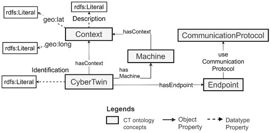 The ontology concepts that are used for generating the semantic descriptions of the CTs. The ontology concepts include Cyber Twin, machine, context, endpoint, and the communication protocol.