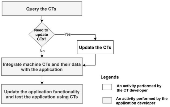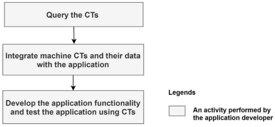 For new application development, the application developer needs to query the machine description via the CT and identify the machine data needed by the application. If the machine produces the data that map the application requirements, then the data need to be integrated with the application via the CT. Finally, it requires the development of the application functionality and the testing of the application using the CTs. These activities are further illustrated in Figure 4.