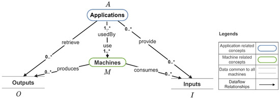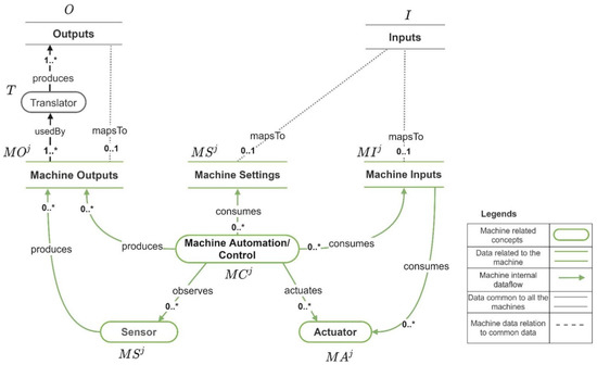 Figure 7 depicts the internal data flow of a machine , including the machine outputs, machine inputs, and machine settings and Figure 6 depicts how they are mapped to set of outputs ( and set of inputs . The set of machine outputs produced by is , the set of machine inputs consumed by is , and the set of machine settings consumed by is . For each machine , , and . In a case where a machine output cannot be directly mapped to an input that needs to be retrieved by an application, the utilization of a data translator (a program that implements the functionality for converting the machine outputs to the required application input) is required. The set of data translators that allow the translation machine outputs are denoted by . and denote the set of sensors and the set of actuators in the machine . denotes the set of machine automation/machine controls in . If is a simple machine, . If is a complex machine . Next, we present the formula for calculating the total cost of developing an Industry 4.0 application.