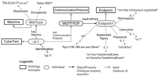 To support CT-based Industry 4.0 application development, the CT generation service also generates and associates a semantic description of the CT with the generated CTs. This description contains the CT ID, machine ID, the context, and the endpoints required to connect with the CT. The ontology concepts that are used for generating this description are shown in Figure 3.