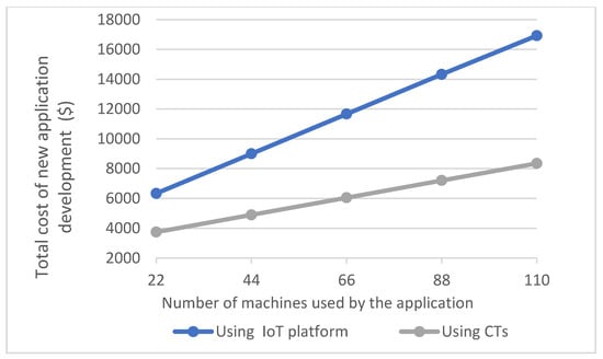 Figure 15 illustrates the application development costs using Azure IoT and CTs with the number of machines used by the application. The application development cost shows a gradual incremental increase in the CT-based approach with the increase in the number of machines used. However, the cost of (directly) using Azure IoT is high when compared to using CTs. This is because Azure requires additional effort to integrate the milk tank emulator with the IoT platform to support application testing. This can be also seen in Table 3, as the effort of developing and testing the application that uses Azure IoT is relatively high (SLoC 159) when compared to the application that uses CTs (SLoC 112). Moreover, it can be observed that there is a sharp increase in the cost of development using Azure IoT compared to using CTs. Moreover, in these instances, the CT-based application development cost is approximately 60% or less than the IoT platform-based Industry 4.0 application development cost. Hence, we can conclude that using CTs to develop the pickup monitoring application is more cost-efficient.