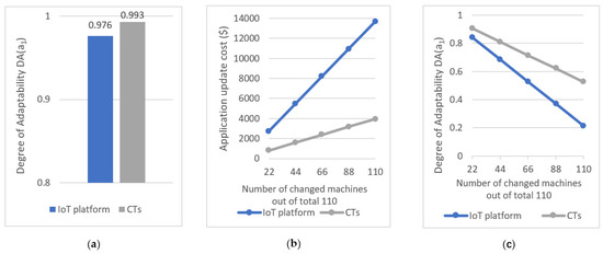 Moreover, we next considered the following scenario to estimate the degree of adaptability of the pickup monitoring application with the number of changed/replaced machines when the application monitors an environment with hundred milk tanks and uses ten pickup trucks for collecting milk. We measured the degree of adaptability of the application when machines out of the total 110 machines are changed/replaced, for = 22, = 44, = 66, = 88, = 110. At each instance, we kept the number of changed milk tanks to the number of changed milk trucks ratio at 10:1. Table 7 (relating to Azure IoT) and Table 8 (relating to CTs) shows the costs involved in updating the pickup monitoring application when it utilizes 110 machines and some of them are changed or replaced. The cost estimations were completed based on the results summarized in Table 6 and the final column of Table 7 and Table 8 shows the degree of adaptability of the resulting application that was calculated using Equation (16). Figure 16b further illustrate the cost of updating the application and Figure 16c illustrates the degree of adaptability of the application with the number of changed machines.