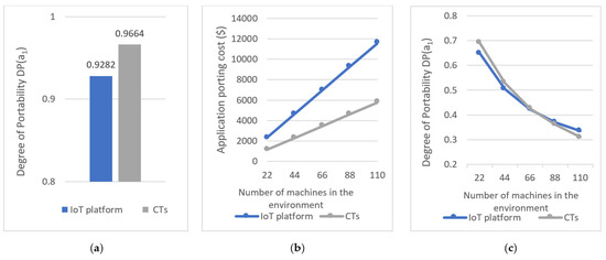 Moreover, we next considered the following scenario to estimate the degree of portability of the pickup monitoring application with the number of machines (i.e., milk tanks and milk trucks) utilized by the application. The degree of portability of the application was measured when the application needs to be ported from to where and each is having milk tanks and pickup trucks, for . The cost estimates were completed based on the results summarized in Table 9 and Table 10 (relating to Azure IoT) and Table 11 (relating to CTs) summarizes the estimated costs involved in porting when the number of machines in the environment that is used by the application changes from 22 to 110. The final column of both tables shows the resulting degree of portability of the applications that were calculated based on Equation (17). Figure 17b further illustrates the cost of porting the CT-based application and the application developed using Azure IoT. Figure 17c further illustrates the change in the degree of portability.
