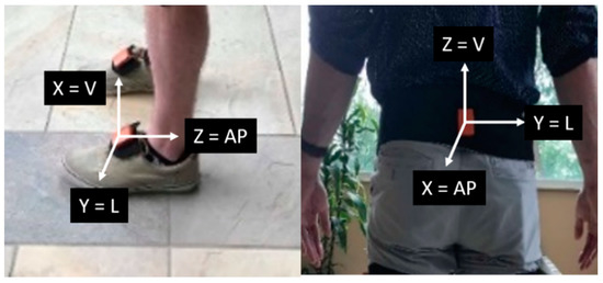 Sensor orientation on both the feet and pelvis. The sensor’s cartesian frame matches the walking direction (L = Lateral, V = Vertical, AP = Anterior-posterior).