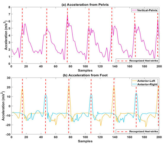 Recognized steps using accelerations from (a) pelvis and (b) foot. The step was recognized by detecting a heel-strike to another heel-strike. Red dotted lines represented the heel-strikes.