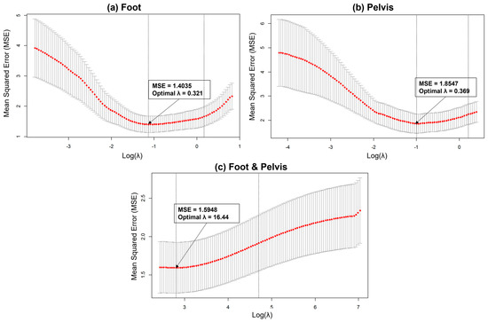 Optimal penalty parameter λ tuning for elastic net: (a) foot, (b) pelvis, and (c) foot and pelvis. The optimal λ for each model was chosen when the MSE was minimum (λ = 0.321, 0.369, and 16.44 for foot, pelvis, and foot & pelvis, respectively).