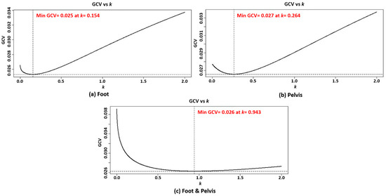 Optimal parameter k tuning for ridge regression: (a) foot, (b) pelvis, and (c) foot and pelvis. The optimal k for each model was chosen when the GCV was minimum (k = 0.154, 0.264, and 0.943 for foot, pelvis, and foot & pelvis, respectively).