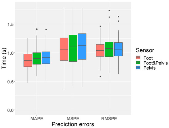 Result of prediction errors. The distribution of each prediction error for the 100-time iterations is shown (The mean values for MAPE are foot (0.865 s), pelvis (0.921 s), and foot & pelvis (0.918 s), for MSPE are: foot (1.124 s), pelvis (1.162 s), and foot & pelvis (1.192 s), and for RMSPE are foot (1.046 s), pelvis (1.065 s), and foot & pelvis (1.075 s)). There was no significant difference of prediction errors between different sensor locations.