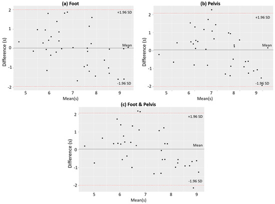 Bland–Altman plot comparing predicted TUG and actual TUG: (a) foot, (b) pelvis, and (c) foot and pelvis. The 95% limits of agreement are shown as two red dotted lines.