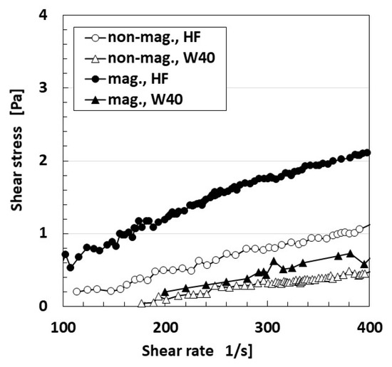 Relationship between shear rate and shear stress of HFs both without a magnetic field (non-mag.) and under a magnetic field of 39 mT (mag.).