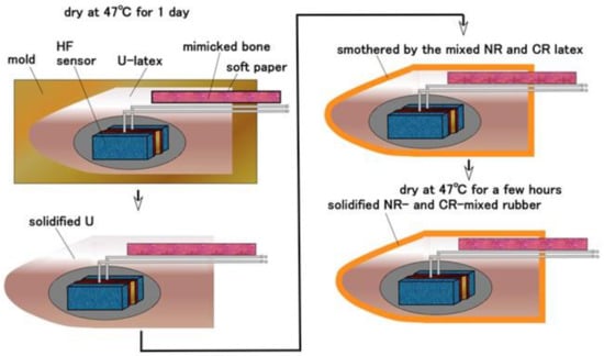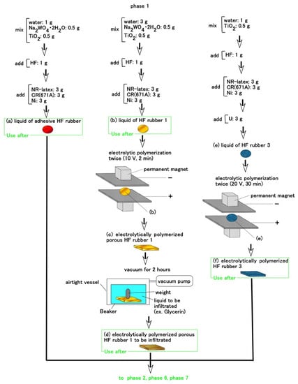 In advance, we prepared an adhesive HF rubber liquid, a permeable solidified HF rubber and a husk solidified HF rubber during Phase 1 (Figure 3). Throughout the production of HF rubber, the cause of compounding TiO2 is that it is electron transport material. Regarding adhesive HF rubber liquid, we used the adhesion technique for bonding between metal and rubber by electrolytic polymerization of diene rubber combined with a hydrate [33], demonstrating its effectiveness at bonding thin electric wire to a rubber. The hydrate, metallic hydrous oxide, sodium tungstate (VI) dehydrate, Na2WO4·2H2O (Fujifilm Wako Chemical Co., Ltd., Osaka, Japan), is compounded in NR-and CR-mixed latex. Where a-adhesive HF rubber liquid is so liquidity as to have a role of spreadable adhesive if more water such as 3 g is used. The liquid of adhesive HF rubber is used in the subsequent phases as an adhesive.