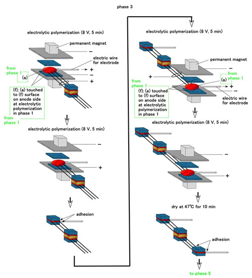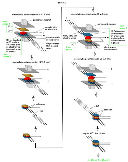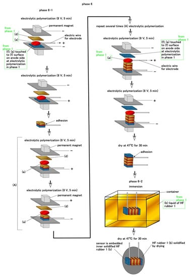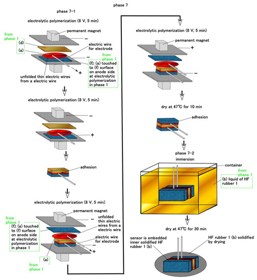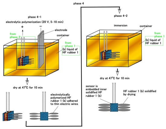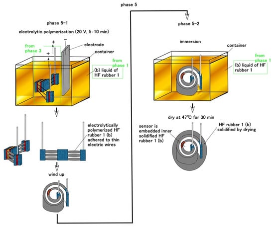Regarding Pacinian corpuscles, the electrolytic polymerization is repeated without inserting thin electric wires during Phase 6 as shown in Figure 8. The HF rubber sensor is embedded in B HF rubber liquid 1 in Phase 1 and dried. The rubber liquid then solidifies around the HF rubber sensor.