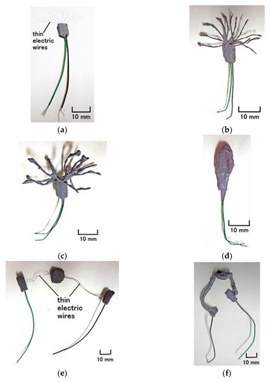 We show the fabrication of free nerve endings, Krause endbulbs, and Meissner corpuscles during Phase 2, as shown in Figure 4. The very thin electric wires were approximately 0.1 mm in diameter and the electric wire for sensor electrodes had an outer diameter of approximately 0.8 mm with seven thin silver-gilt electric wires of roughly 0.1 mm in diameter inserted into adhesive rubber liquid a such that they were sandwiched between permeable rubber D and rubber f. Permeable rubber D is sandwiched between rubbers F by electrolytic polymerization using adhesive rubber liquid a. Here, attention must be paid to the side of rubber F exposed to adhesive rubber liquid a. The exposed side of rubber F facing outward should be the surface on the cathode side during electrolytic polymerization in Phase 1 and has the concave and convex shape shown in [34]. If the surface is the opposite, that is, the anode side during electrolytic polymerization, it will not be able to adhere well to U. Owing to its concave and convex shape, the surface that was on the cathode side can adhere to U. This technique is significant in the fabrication of artificial human skin. Spontaneous voltage occurs through the mediation of permeable rubber d.