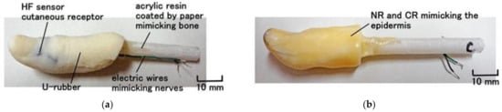 We first fabricated the five types of the cutaneous receptor using HF rubber. Each cutaneous receptor has the schematic and organization of nerve endings shown in Figure A1: free nerve endings, Krause endbulbs, Meissner corpuscles, Pacinian corpuscles, Ruffini endings. We mimic the shape by replacing nerve endings with very thin electric wires and capsules with HF rubber. Next, the mimicked cutaneous receptor was embedded in U-rubber by molding and a body part was simulated. We adopt a thumb. U-rubber is highly stretchable, bendable, elastic enough to realize a soft motion of the body rather than any other rubber involving Q and NR.