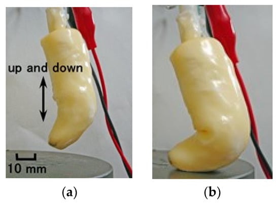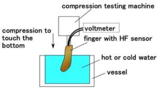 At first, as shown in Figure 14, we investigated the response to the application of normal force and thermal body by using the same normal force experiment (NFE) apparatus [34]. The finger was moved to touch hot or cold water, continuing to touch the bottom of the vessel. The up and down motion in the water was repeated five times by a compression testing machine (SL-6002; IMADA-SS Co., Ltd., Toyohasi, Japan) at a velocity of 300-mm/min. The voltage from the sensor was measured by a voltage meter (PC710, Sanwa Electric Instrument Co. Ltd., Tokyo, Japan). The finger can bend very softly, as shown in Figure 15.