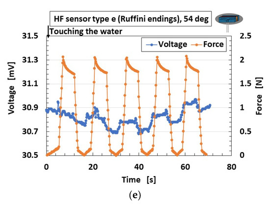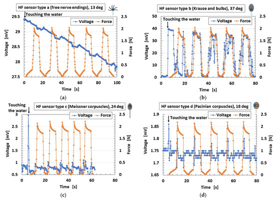 Figure 16 shows the results at each HF sensor cutaneous receptors (Types A–E). The instant that the finger touches the water is indicated in each case. Regarding thermal response, Figure 16b–d show that the HF sensor is sharply responsive to the thermal input. In the case of the Type-B sensor, the thermal response is conspicuous. There is no thermal response in Types A and E. This sharp response in a human is so effective that the human can perceive the thermal input instantly upon touching with shouting. Therefore, the goal of the present simulation is the perception of a healthy human. The fabrication of the HF sensor, both in its materials and in its multi-layer structure, contributes to its ability to receive thermal input.