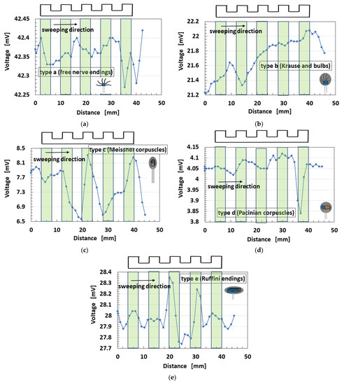 Voltage of each of the cutaneous receptors at shear motion on a body with alternate surface roughness: (a) Type A; (b) Type B; (c) Type C; (d) Type D; (e) Type E.