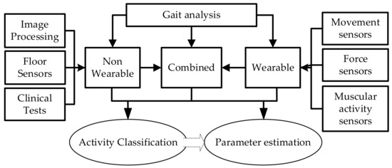 | Inertia measurement unit (IMU) | 3-axis accelerometry and gyroscopic data can be obtained and processed to estimate spatiotemporal parameters. Foot clearance can be estimated with integrational methods although is very inaccurate. They are used on 18 of 35 of the studies surveyed | Inexpensive Signals are easy to measure | Drift Non-direct parameter estimation Placement dependent | [8,20,39,48,49,50,51,52,53,54,55,56,57,58,59,60,61,62,63] |