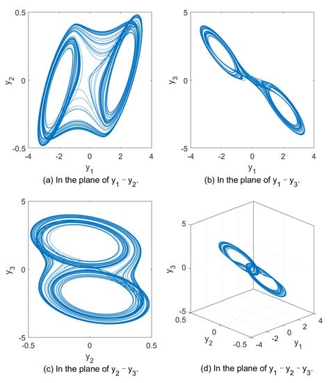 Let us consider the three-dimensional fractional-order Chua’s chaotic system [36] of the following form: