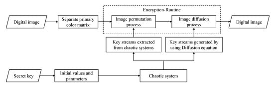 Owing to the rapid development of internet and multimedia technologies, a great number of images have been used in various applications. Since images are usually required to be confidential between the sending side and the receiver end, the protection of images by encryption becomes more and more important. During the past several decades, different techniques have been introduced to design the image encryptions [1,2]. Among them, chaos-based encryption, which was first explored by Matthews in [3], is considered as one of the most excellent encryption methods in consequence of the good property of chaos, such as high sensitivity to initial value conditions, state ergodicity and nonconvergence [4,5,6]. Based on these advantages, some more complex encryption schemes consisting of chaos and other ways, such as information entropy [7], mixed linear–nonlinear coupled map lattice [8], a pseudo-random numbers generator [9] or the genetic algorithm [10] have been investigated. However, the control parameters for permutation in above-mentioned algorithms are all fixed and the key extracted from the chaotic signals depends only on the keys, which degrade the performance of the cryptosystems.