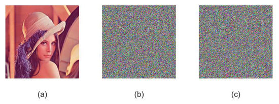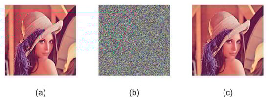 Experimental results for Lena image. (a) Original image of Lena, (b) encrypted image of Lena, (c) decrypted image of Lena.