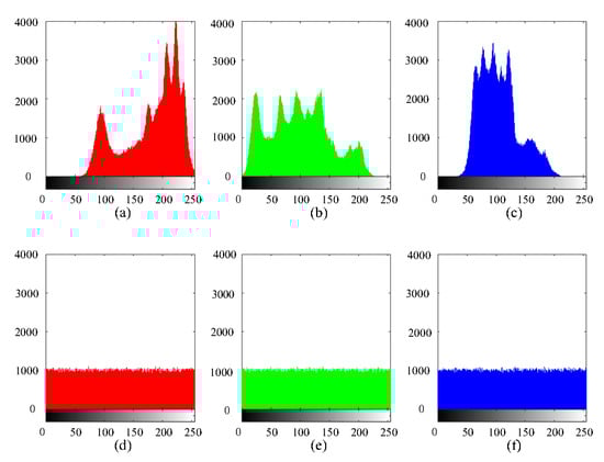 Histograms of plaintext images ((a) red, (b) green, and (c) blue components) and ciphertext images ((d) red, (e) green, and (f) blue components).