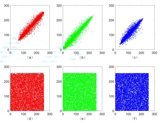 Correlation of adjacent pixels in vertical direction in plaintext images ((a) red, (b) green, and (c) blue components) and ciphertext images ((d) red, (e) green, and (f) blue components).