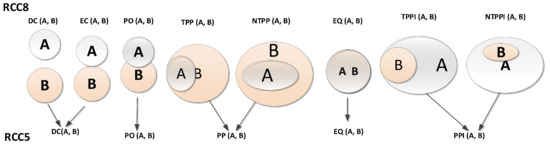 - Baode, J.; Qi, W.D. An Intersection Model of RCC-5 for Spatial Relationships and its Application. J. Softw. Eng. 2017, 11, 102–108. [Google Scholar] [CrossRef]