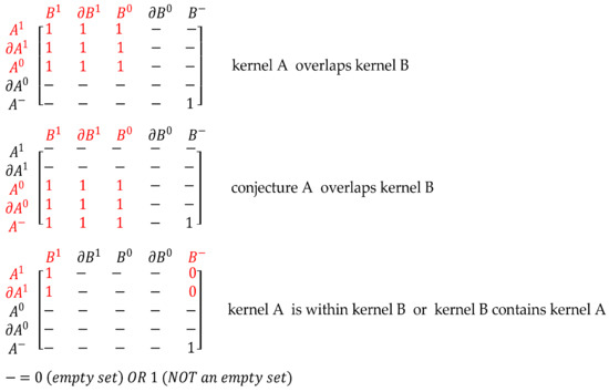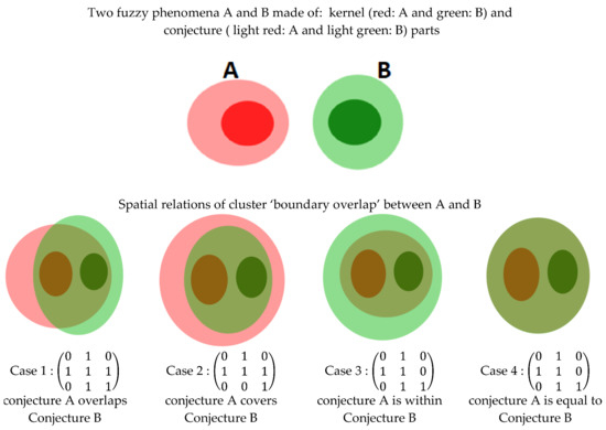 Evaluating the relation of the type contain or cover between parts of A and B depends on units expressing the intersection of any part of A or B and the exterior of the related phenomenon. For instance: if and , the kernel of A is contained by a given part of B. Identifying which part of B contains the kernel A is necessary; if kernel A overlaps kernel B then we can check if the conjecture of B contains kernel A: and .