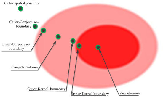For each monitored phenomenon, a sensor location will belong to the kernel or conjecture part if the phenomenon is detected, otherwise the sensor will be in the exterior of the phenomenon. The detection of phenomenon A (Kernel A or Conjecture A) by a sensor triggers the preparation and propagation of queries to one hop (directly linked) neighbors named N(s) through the communication mesh materialized by links between nodes. This collaboration among nodes aims at inferring spatial information about the extent and geometry (spatial boundaries) of phenomenon A. Then, to describe A’s geometry, seven spatial categories of sensor nodes can be identified, [24]. These categories are: kernel–inner; inner-kernel–boundary; outer-kernel–boundary; conjecture–inner; inner-conjecture–boundary; outer-conjecture–boundary; or outer, as shown Figure 4.