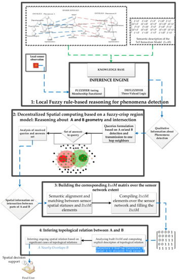 Hence, in this paper, we propose and develop a novel decentralized fuzzy rule-based spatial reasoning approach based on the () to depict the spatial relations that hold between two phenomena with fuzzy boundaries monitored by a sensor network. In this approach, sensor data are used to describe five distinct states for each sensor with respect to each spatially evolving continuous phenomenon with fuzzy boundaries. The structure and values in are used to describe and depict spatial relations that hold between monitored phenomena at a given time with the aim of better supporting the spatial decision-making process. In this approach, partial and local spatial relations between monitored phenomena are deducted from sensor observations of individual sensor nodes and their collaboration with linked neighboring nodes, while the spatial relations as a whole and their changes are inferred overall to the SN extent. The proposed approach is then applied to a case study and its advantages and limitations are discussed.