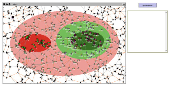 In Figure 7, black lack nodes represent sensors in the outer part of the phenomena while colored nodes express the detection of the phenomena. In addition, the differences in sizes of the nodes express the parts of spatial extent of the observed phenomena (kernel, conjecture). The lines represent communication links, and when colored in orange, the links are part of the spanning tree.