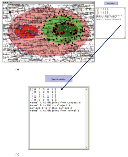 A vague-shaped region considered in the 44 topological relationships presented in [33] is based on the egg-yolk model of fuzzy regions [35]. Tang et al. [18] have considered spatial regions with broad boundaries with settings in which the yolk (kernel) part may be out of the white (conjecture) and have shown possible settings of a simple fuzzy region. Based on this consideration, the 9IM seems irrelevant to model spatial relationships between such vague-shaped regions, and Tang et al. [18] suggested the use of a 4 × 4IM (16IM) for modeling 152 cases of realizable spatial relations, but qualitative specifications about these relations require supplementary analysis over the resulting 4 × 4IM. It is in the same order that the Dimensionally Extended 9IM is developed as an appropriate model for analyzing topological relationships between complex regions with broad boundaries [36]. The dimensional extended 9-intersection model (DE-9IM) extended the 9IM by considering the dimensions of inferred intersections; DE-9IM can distinguish more detailed topological relations compared to the 9IM [21].