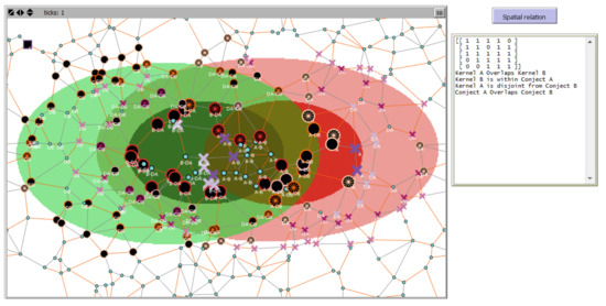 Excerpt of Netlogo environment showing A’s boundary covering B within SN extent.