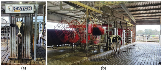 Robotic dairy facility used for this study showing (a) the crush where the cows were restrained for visible and infrared thermal video (IRTV) recording and (b) robotic milking area to the left of crush where the cows were redirected after data collection.