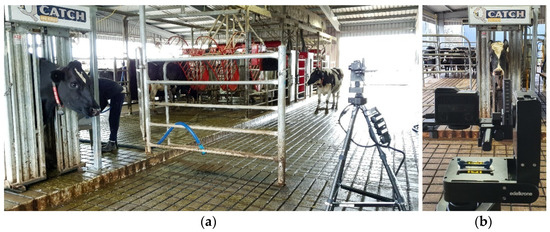 This study was approved by the Animal Ethics Committee of The University of Melbourne (Ethics ID: 2021-21466-18833-5). The experiment was conducted on four dates in a southern hemisphere winter (14–15 July and 4–5 August 2021) from 9 am to 4 pm in the robotic dairy facilities located at The University of Melbourne Dookie College, Victoria, Australia (36°38′ S, 145°71′ E). These facilities consist of three Lely Astronaut robotic milking units (Lely Holding S.à.r.l., Maassluis, The Netherlands) with laser-guided teat detection, which can milk up to 180 cows a day. The system works on semi-voluntary milking where cows are motivated by individually formulated supplementary feed and an automatic Lely Luna brush for cows’ comfort. A total of 102 different and non-stressed Holstein-Friesian cows with one to five replicates for the analyses were used for this study (n = 282). The replication per cow varies because the cows assessed per day were based on semi-voluntary milking, as previously explained, and were not forced to participate in the study. When cows approached the facilities for milking, some of these were directed to the crush before and others after milking (Figure 1a) to be recorded, as explained in Section 2.2. If the cows showed signs of high stress, they were released and excluded from that measurement to comply with ethics regulations. Once the recording was over, they were redirected to the milking area either for milking or to obtain some individually formulated supplementary feed (Figure 1b). This approach of having some cows milked before or after the recording was made to avoid bias due to the milking factor.