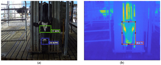 Example of a frame obtained and analysis from (a) a visible RGB video showing the regions of interest used to obtain heart rate (eye section, yellow rectangle) and respiration rate (nose, blue rectangle) showing the mean values after analysis displayed for a specific cow and (b) an infrared thermal video (IRTV) showing the region of interest used to analyze eye temperature and the mean value displayed for a specific cow.