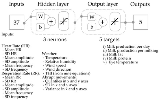 An artificial neural network (ANN) model was developed using a code written by the DAFW-UoM group (Matlab® R2021a), which can automatically test 17 different training algorithms to find the best model based on accuracy (correlation coefficient: R) and performance (means squared error: MSE) with no signs of under/overfitting. The Bayesian regularization was selected as the best training algorithm using the data from the physiological parameters obtained from the RGB videos (HR and RR), the weather information and abrupt movements in x and y axes (Figure 4). The targets for the model consisted of milk production (per day and per milking), milk composition (fat and protein) and eye temperature based on the IRTV. Apart from the performance, a condition to avoid under or overfitting of a model is to keep the number of inputs at <70% of the number of samples, which this model meet with 37 inputs <70% of samples (105). From n = 282 cow recordings, 150 were randomly selected to develop the model, while the remaining 132 were used for deployment. To develop the model, samples were divided randomly as 70% (n = 105) for training and 30% (n = 45) for testing. A neuron trimming test (3, 5, 7 and 10 neurons) was conducted to find the best model with no signs of under/overfitting.