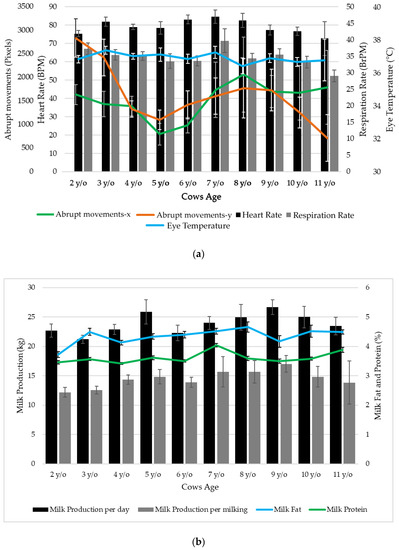 Figure 5a shows that cows within 6 and 8 years old had slightly higher HR (83–85 BPM) than younger or older cows (73–82 BPM), a similar trend was shown for RR of cows 7 years old, which had the highest mean value (40 BrPM) compared to other cows (29–37 BrPM). The abrupt movements in this figure were reported as a variance of x and y axes; therefore, this figure shows that the 5- and 6-year-old cows had fewer movements in both directions (x and y axes) compared to younger and older cows. Furthermore, the most aged cows (11 years old) had low movement in y-, but high on the x-axis. On the other hand, all cow age groups had similar mean eye temperature; however, cows 8 years old had slightly lower values.