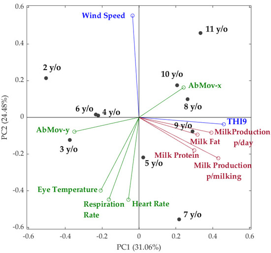 Figure 6 shows that the PCA accounted for 55.54% of total data variability based on principal components one and two (PC1: 31.06%; PC2: 24.48%). Based on factor loadings (FL), PC1 was mainly represented on the positive side of the axis by THI9 (FL = 0.46) and milk production per milking (FL = 0.43) and by abrupt movements in the y-axis (FL = −0.35) on the negative side. On the other hand, PC2 was characterized by wind speed (FL = 0.55) on the positive side of the axis and HR and RR (FL = −0.45) on the negative side. It can be observed that the wind speed was negatively related to eye temperature, RR and HR, while the last three were positively related among them. Furthermore, all milk parameters were positively related to THI9 and negatively related to abrupt movements in the y-axis. Older cows (8–11 years old) were grouped and associated with the milk parameters, THI9 and abrupt movements in the x-axis, while younger cows 2–4 and 6 years old were grouped on the opposite side from older cows. Middle-aged cows (5 and 7 years old) formed another group and were more associated with the physiological parameters (RR and HR).