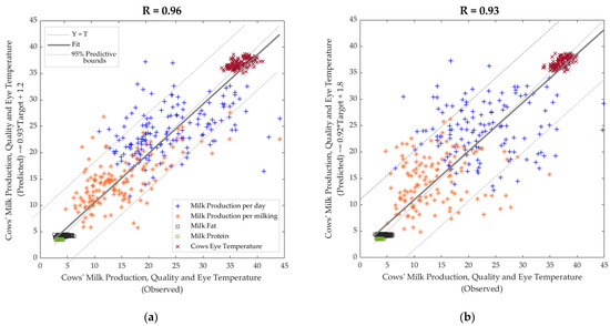 Table 2 shows that the machine learning model had high overall accuracy (R = 0.96) with high slope values (>0.92) to predict the milk production and quality based on composition (fat and protein) and cows’ eye temperature using the physiological, weather and abrupt movement parameters as inputs. There were no signs of under or overfitting based on the performance values with lower training MSE (9.65) than the testing (MSE = 23.72) stage.