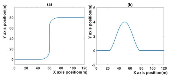 The first scenario is shown in Figure 2a: the vehicle runs on two curved roads in a row. In the beginning, the vehicle runs on a straight road of 40 m length and turns left into a curved driving section with a 20 m radius of gyration. Subsequently, it runs on a 40 m straight driving section and enters a (right-turning) curved section with a 20 m radius of gyration. The scenario ends when the 40 m straight driving section has been passed. The initial speed of the vehicle is 20 m/s, the prediction horizon is 10, and the control horizon is 2. The prediction horizon indicates the amount of data that MPC references to calculate the next prediction. The prediction horizon affects tracking performance and computation time. However, in this paper, it is set as a fixed constant. Many papers set the prediction horizon to 10 [7,20]. In an MPC system with a prediction horizon equal to 10, tracking performance and computation time are reasonable, so the prediction horizon is set to 10. The value of , which is a constant in Equation (47) is 0.0045, and C, which is a constant in Equation (47), is −0.001. In addition, the experiment is performed at different sampling times: 0.2, 0.1, and a variable sampling time.