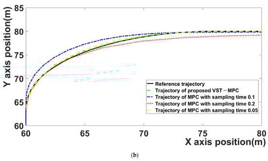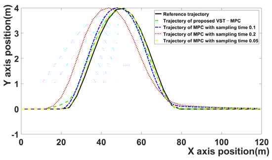 The computation time of the proposed MPC algorithm is increased compared to the computation time of the MPC algorithm with a 0.2 sampling time and the MPC algorithm with a 0.1 sampling time. However, the average tracking performance of the proposed MPC algorithm is improved compared to the average tracking performance of the MPC algorithm with 0.2 sampling time and the MPC algorithm with 0.1 sampling time. The computation time of the proposed MPC algorithm is decreased compared to the computation time of the MPC algorithm with a sampling time of 0.05. The average tracking performance of the proposed MPC algorithm is similar to that of the MPC algorithm with a 0.05 sampling time. This confirms that the computation time can be shortened while maintaining similar performance in terms of tracking performance when the proposed VST-MPC algorithm and the MPC algorithm with the shortest sampling time are compared.