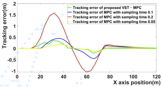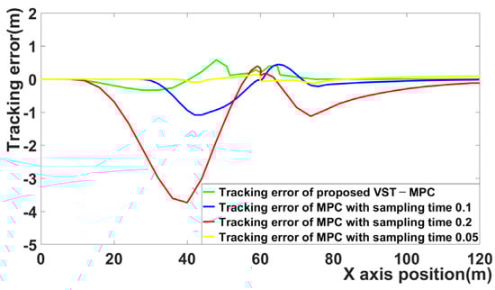 Figure 11 shows the tracking errors of the four MPC algorithms. When the sampling time is 0.2 and 0.05, the tracking error is large. By contrast, the proposed VST-MPC algorithm does not have a large tracking error. Even compared to MPC with a 0.05 sampling time, the tracking error of the proposed VST-MPC is similar with the MPC with a 0.05 sampling time.