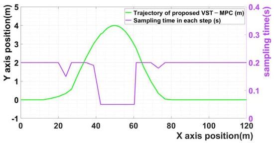 Figure 3 shows the sampling time of scenario 1 in each step. The violet curve is the sampling time in each step. The results indicate that the sampling time changes based on the calculated input values of the lateral acceleration and steering angle when the vehicle enters the curved driving section. Owing to the effect of the proposed MPC, a low sampling time was selected for the curved driving section, and a high sampling time was selected for the straight driving section.