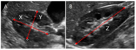 Ultrasound image of a kidney. (A) Transverse section. X is the maximum depth of the kidney parallel to the hilum, and Y is the maximum width perpendicular to X. (B) Coronal section. Z is the maximum bipolar length.