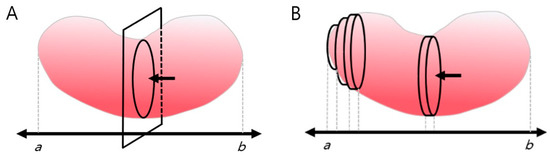 The number of pixels inside the kidney border was summed up to calculate the transverse section’s area automatically. Since the kidney’s hilum is anatomically likely to be located near its center [30], the hilar region was designated as the standard point for calculating the transverse section area. After calculating the area of the hilar region’s transverse section based on image segmentation, the area along the longitudinal axis (ab) of the coronal section was integrated to reconstruct the three-dimensional (3D) shape of the kidney, and its volume (IMGSEG_Vol) was calculated (Figure 2).